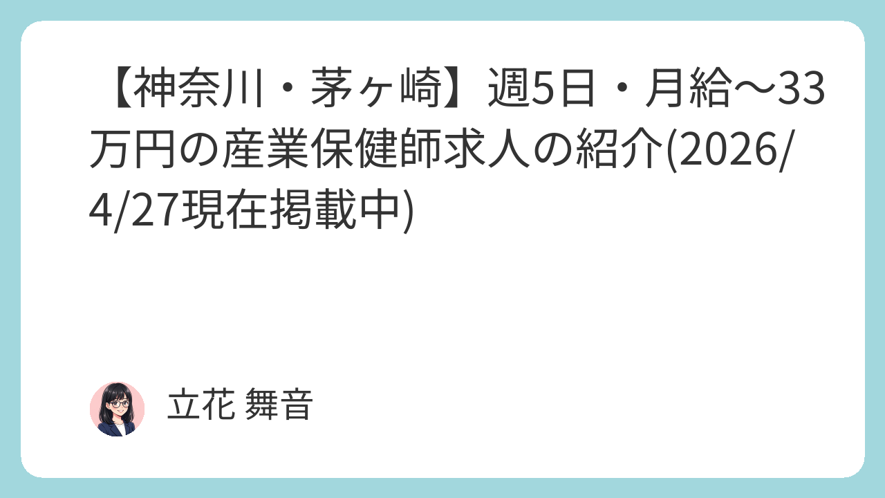 神奈川県茅ヶ崎エリアにおける、企業内産業保健師の常勤求人です。週5日勤務で安定した働き方が可能でありながら、土日祝休み・日勤帯のみという、ワークライフバランスの取りやすい環境が整っています。